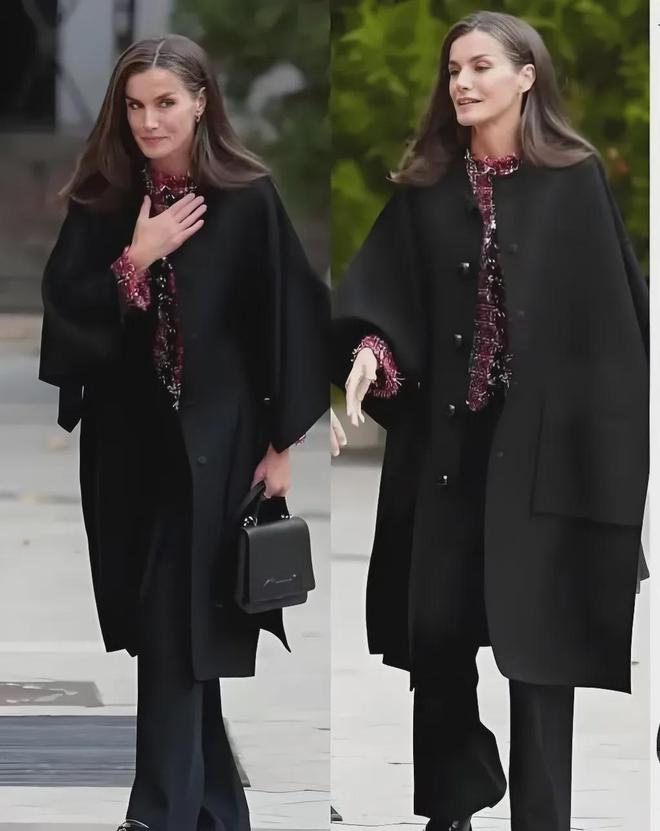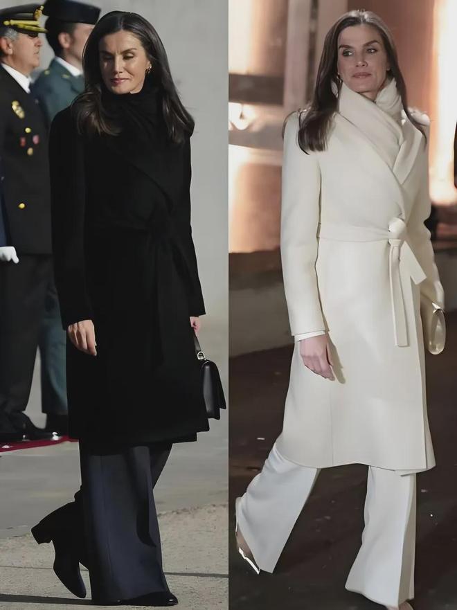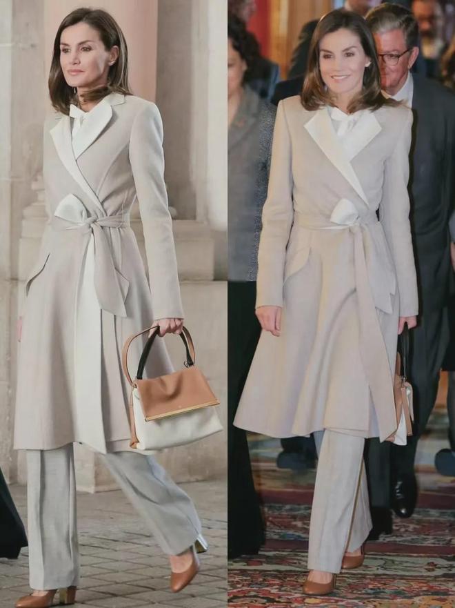除了是因为她自身的身材条件比较好的原因以外,也离不开搭配技巧的加持。西班牙王后穿大衣配阔腿裤的时候,大衣长度从来不会太长,最多到大腿中部。